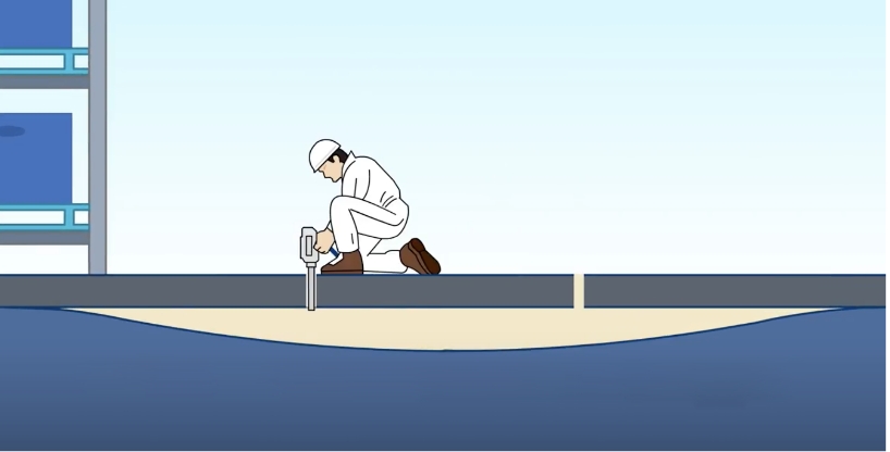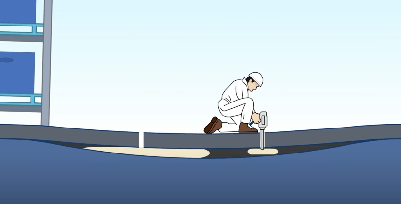 傾きを計測。修正箇所に1円玉より小さい注入孔をあけ、テラテック樹脂をコントロールしながら注入し、膨張させます。